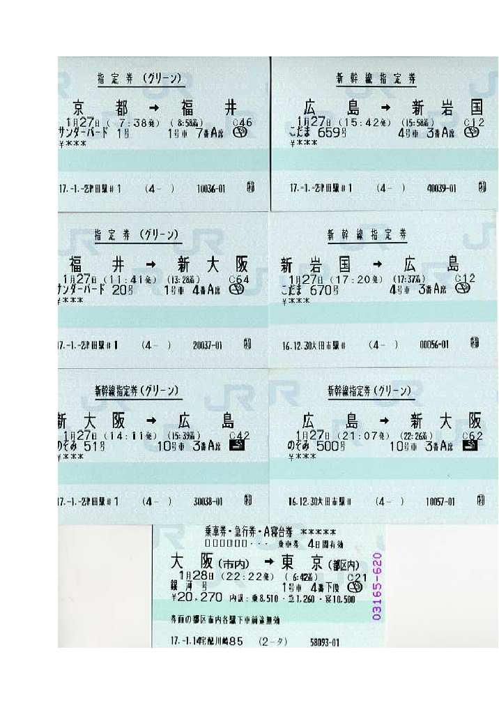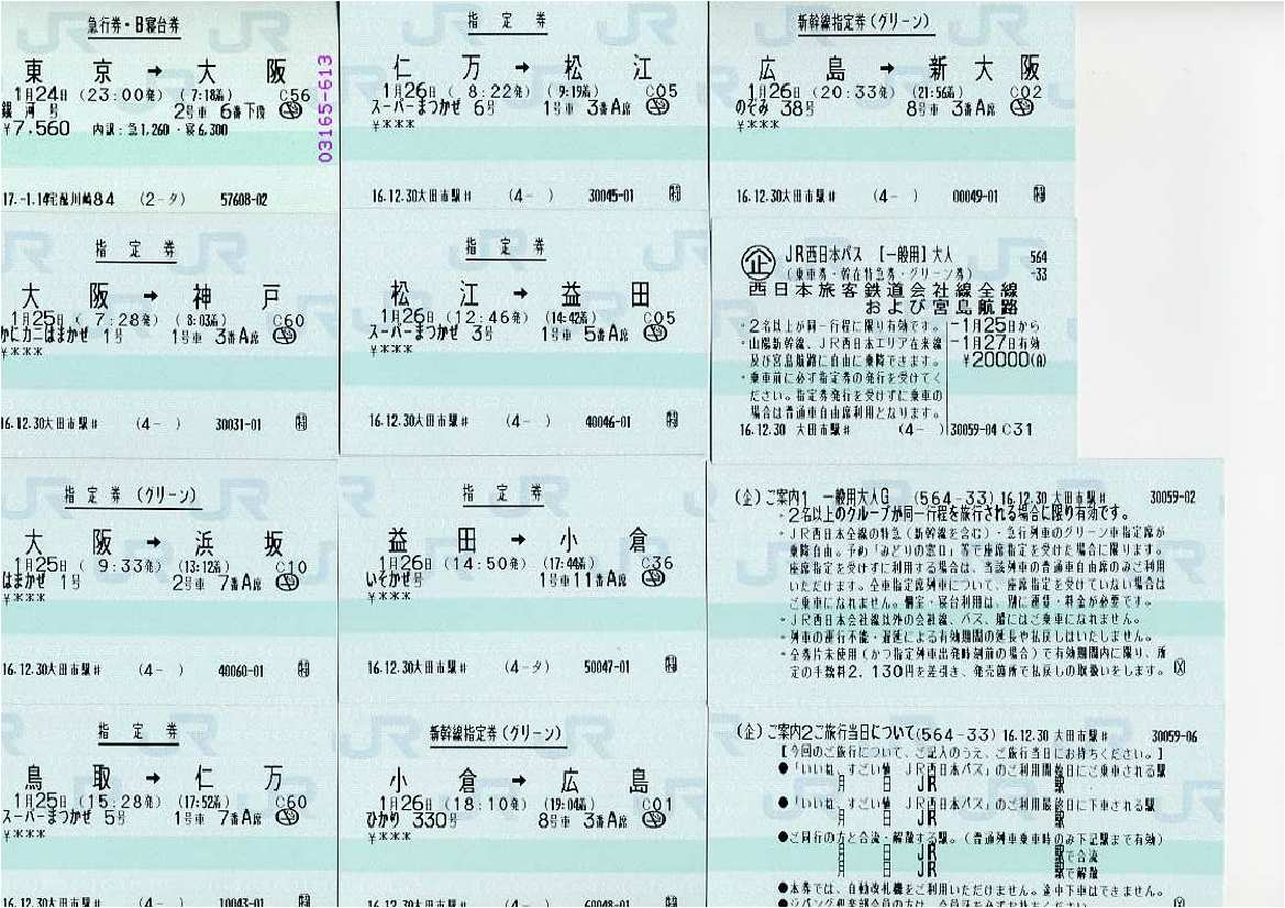 | のすたるじっくつあーU 旅程の検討?(始まり) 前回の「のすたるじっくつあー」失敗?の反省と愚痴をあっちこっちで話していると「あさかぜの」廃止のニュースが飛び込んできました。 「あさかぜ」が廃止になるくらいだから「はまかぜ」の181の運用も時間の問題かと言う話になって、 同好のS氏から「銀河」で行って「出雲」で帰って来るという、餘部鉄橋と松葉蟹の旅はいかが?との提案でリベンジを計画することになりました。 贅沢ついでに岩美町の「くるーず」で「カニ三昧つあー」は?と話はどんどん膨張していきます。 ところが「出雲」は今回の廃止対象に無く、存続で調べてみると「いそかぜ」が廃止ととのこと。 ここでS氏が2日の休みを利用し「はまかぜ」と「いそかぜ」に乗って「あさかぜ」で帰ってくることが可能か調査することになりました。 いいねすごい値切符 さて、WebでJR西日本を調べていると「いいねすごい値切符」と言うのを発見・・・ 最初の段階ではトピックに同名称の企画切符を発売との記事でJR西の管内を自由に乗り降りでき特急指定を利用可能と説明されていました。 早速メールで寝台を利用の場合の乗車券の処置について質問しますと(乗車券が有効ならば「銀河」の場合、東京−米原でイイか?)返答は、寝台列車については乗車出来ない、したがって別途寝台券を購入しても乗車券も必要とのことでした。 しかし計算すると「銀河」と「あさかぜ」を別途購入してもこの切符を利用した方が安く行けることが判明ました。 そこで疑問が「寝台列車」は乗れない?でも「サンライズ」には普通指定席車が有る?今度は電話で問い合わせました。 なかなかつながらないのでJR西の有料問い合わせ(電話料金が掛かる)へ電話を入れると、担当者は即「調査の上、返答します」と此方の電話番号を聞いてきました。 丁度留守中に連絡があり、内容は「サンライズ」も普通指定席は利用可能・米原は停車しないので新大阪から同切符は有効との返答でした。 あれ?時刻表では「サンライズ」は新大阪も止まらないけど? そこで再度の電話を掛ける。 先ほどの方の名前を告げると対応中なので自分が受けると言われ説明を始める。ところが明らかに内容を理解できな様で途中から返事も生返事になり前の担当がもうすぐ電話を終えると言い出す。しかもどういう事か聞くとこちらの質問への返答ではなく「まだしばらく掛かりますがこのまま待ってください」と言い出す?この人は自分でも答えられると思い聞き始めそれが自分のキャパを越えた所から逃げを打ち「しばらく掛かるが待て」ってワケ? 最初の人は判らないと気づいた時に「折り返しの電話でよいか」と聞いてきた。 既に細かく説明しているのだから相応の時間も経っているのに「待て」は無いんじゃない? ちょっと怒ったら「此方から電話致します」って 前回の八条精算窓口の駅員と同じだね。 さて、再度の電話で(最初に受けた方から)説明を「新大阪から有効は新幹線のことです」とおっしゃる?「サンライズ」は最初のJR西の停車駅から有効とのこと。 でも?この時は新幹線の事なんか聞いていないんだよね! 最初の停車駅を強く主張するので新幹線に付いて質問「新大阪からと言われたが乗車券は最初の停車駅から使えるか」と聞くと「使用可能」と返答される? 乗車券は京都から有効だが新大阪まで利用の場合は京都−新大阪間の特急料金が別途掛かるとのこと不思議に思い、米原停車の「ひかり」に乗って行くとどうなるか聞くと「東京−米原の乗車券と東京−新大阪の特急券」と答えてきた?それは変だと聞き直し乗客側が乗車する列車に応じて必要な乗車券を判断するのはおかしいと聞くが「最初の停車駅から乗車券は有効です」と言い張る?? そこで、たとえば北陸線内の駅(JR西の駅)から大阪までの切符を購入し米原で新幹線に乗り換えるのと同じか?と聞く「JR西で乗車券を大阪まで購入済みだから特急券だけでよい」とのこと?? そう言えば「いそかぜ」の場合はJR西日本の特急なのでは下関−小倉の乗車券だけ別途必要で特急券は不要って返答の逆か!と納得した。 ついでに、この切符はJR西の指定された窓口でしか販売しないことを心配してくれたので、「買いに行くから」と返答したら不思議そうだったっけ。 12月30日大田駅 今年は娘と二人でお寺に来ていたのですが、彼女が「青春18切符」と言うヤツで木次線と三江線に乗りに行くため仁万駅まで送りに行く 9:18分に乗せた後、駅員さんに「いいねすごい値切符」は大田市駅で売っていることを確認し大田市へ、予め用意の旅程表を出して「山陰線内は海側で」と依頼する。ところが当日は12月30日次々に切符を買いに来るお客が、しかも券売機では買えない切符ばかり?そのたびに「お先にどうぞ」と・・・ 私の切符に掛かっていると乗り遅れそうになる人が出たり?先にと譲った人が思いの外、時間が掛かったり、12枚の座席指定券の発券に2時間近く掛かってしまいました。 さて仁万